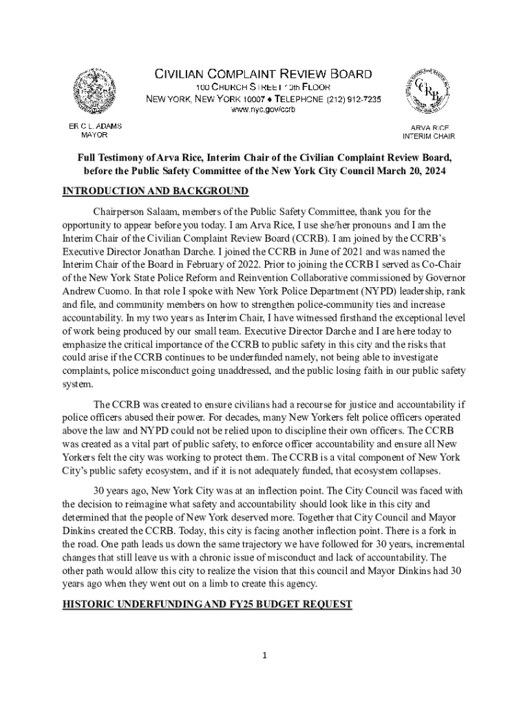 This document is the full testimony delivered by Arva Rice, Interim Chair of the Civilian Complaint Review Board, highlighting the critical need for funding and the importance of the CCRB in maintaining