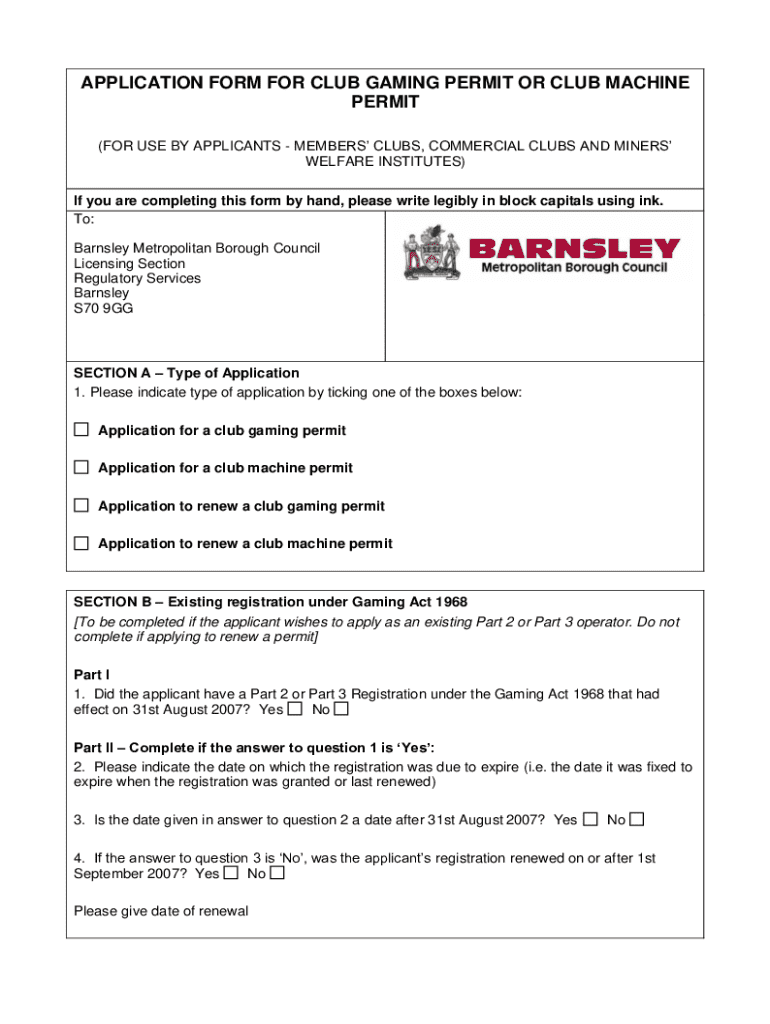 Get the free Application Form for Club Gaming Permit or Club Machine Permit