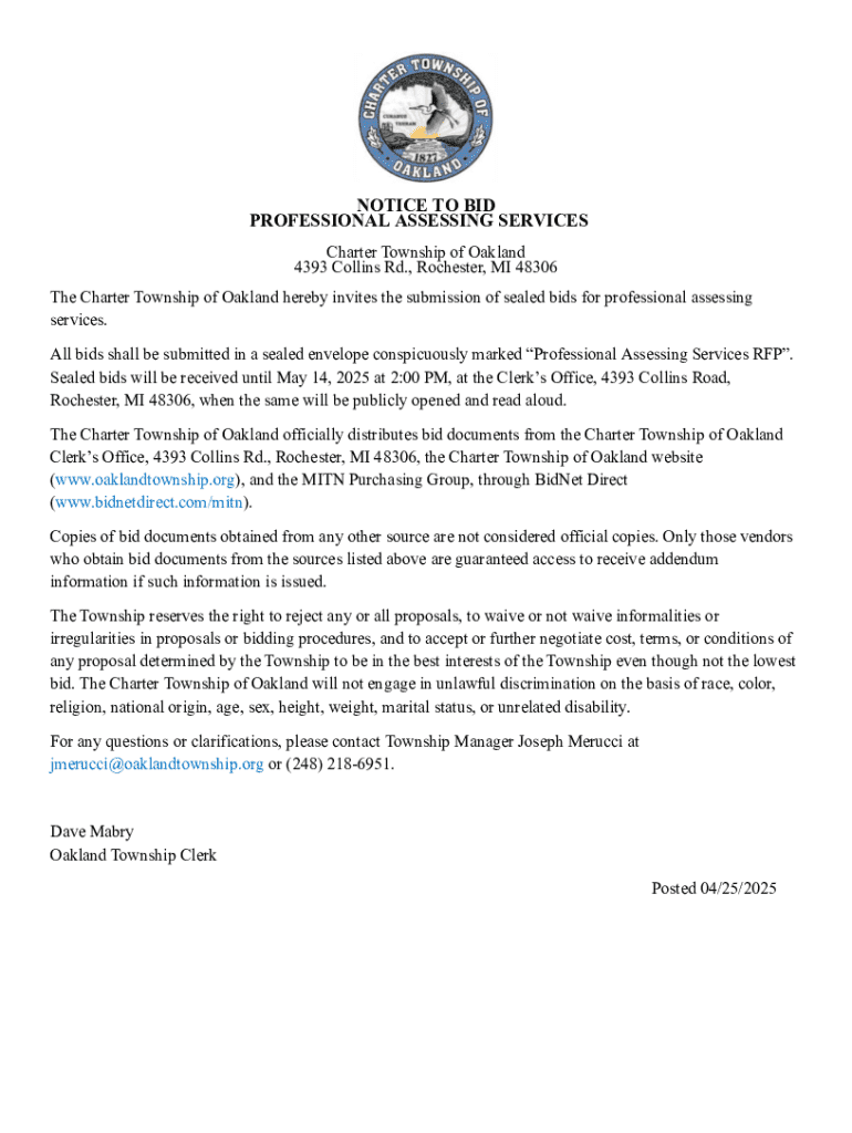 The document invites the submission of sealed bids for professional assessing services by the Charter Township of Oakland, detailing submission guidelines, scope of work, qualifications, insurance