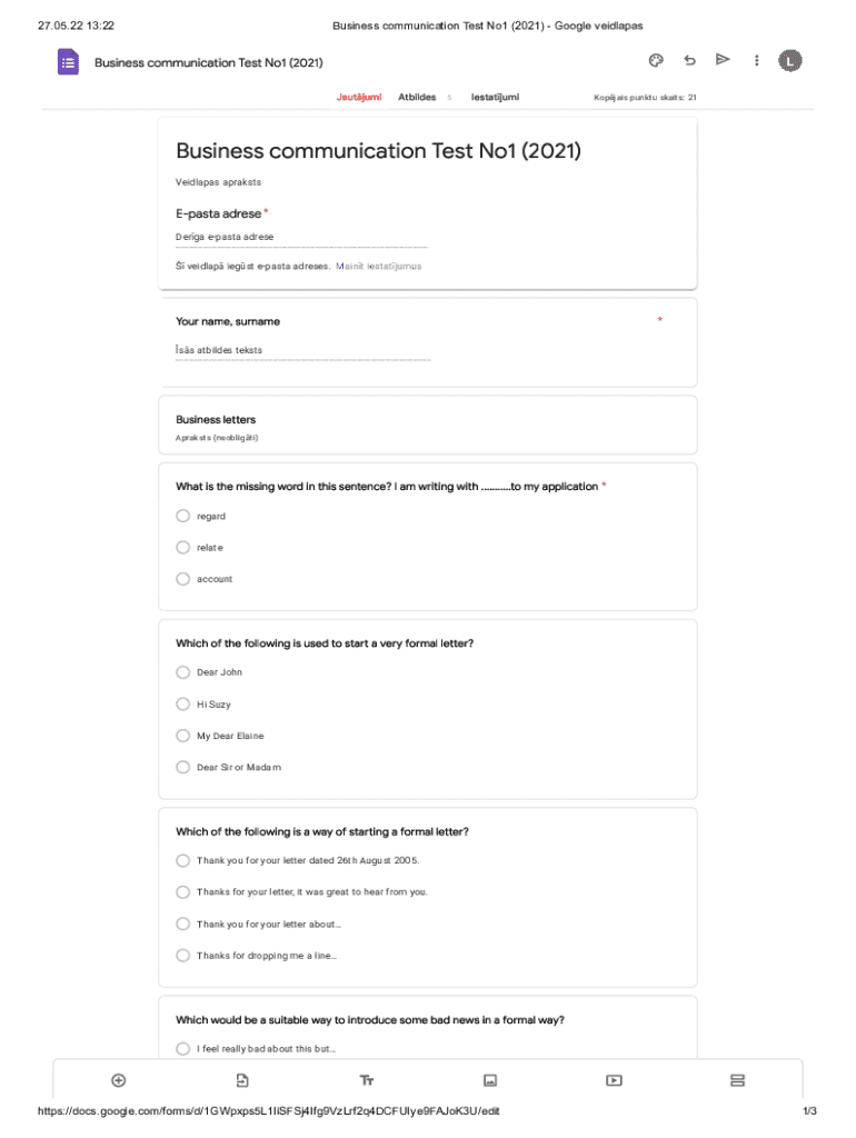 Each section of the Business Communication Test No1 form must be completed thoroughly for accurate assessment. The form is divided into segments such as personal information, communication assessment questions, and a feedback section.