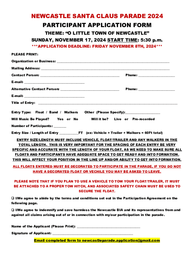 The Newcastle Santa Claus Parade form is essential for ensuring that all participants—whether they are floats, marchers, vendors, or volunteers—are appropriately registered for the event. This form outlines the necessary information and agreements needed to engage in the parade safely and effectively.