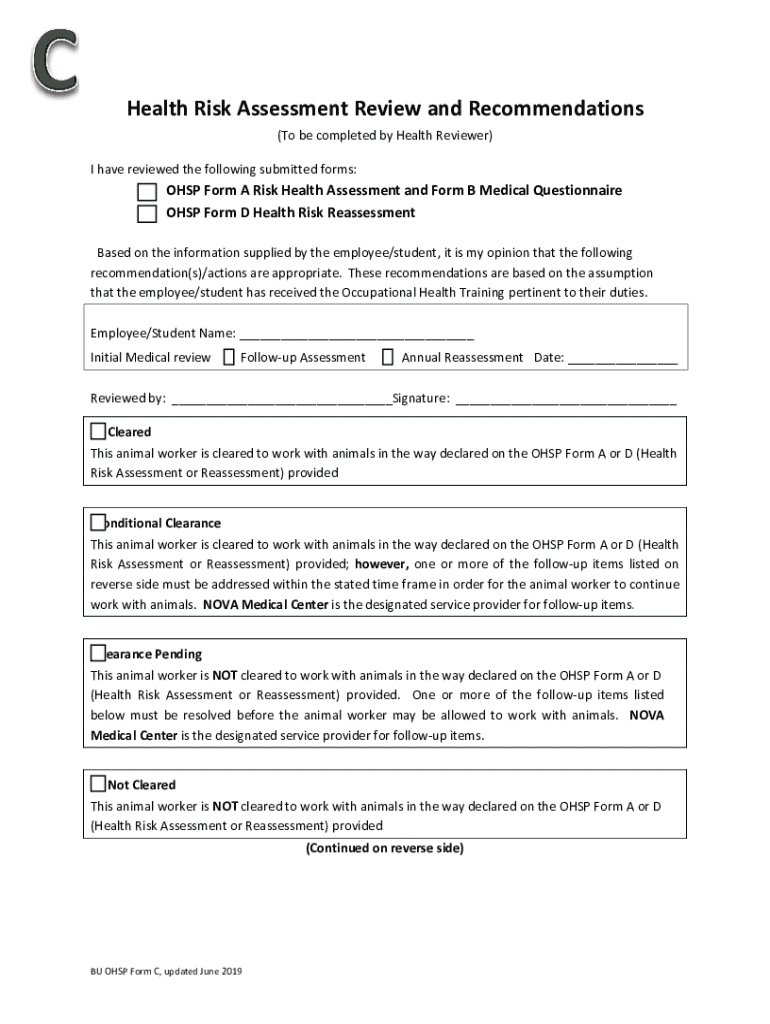 The BU OHSP Form C is an integral component of Boston University’s Occupational Health and Safety Program (OHSP). This form is designed to assess risks, ensure compliance with safety regulations, and promote a safe working environment for faculty, staff, and students engaged in university-related activities.