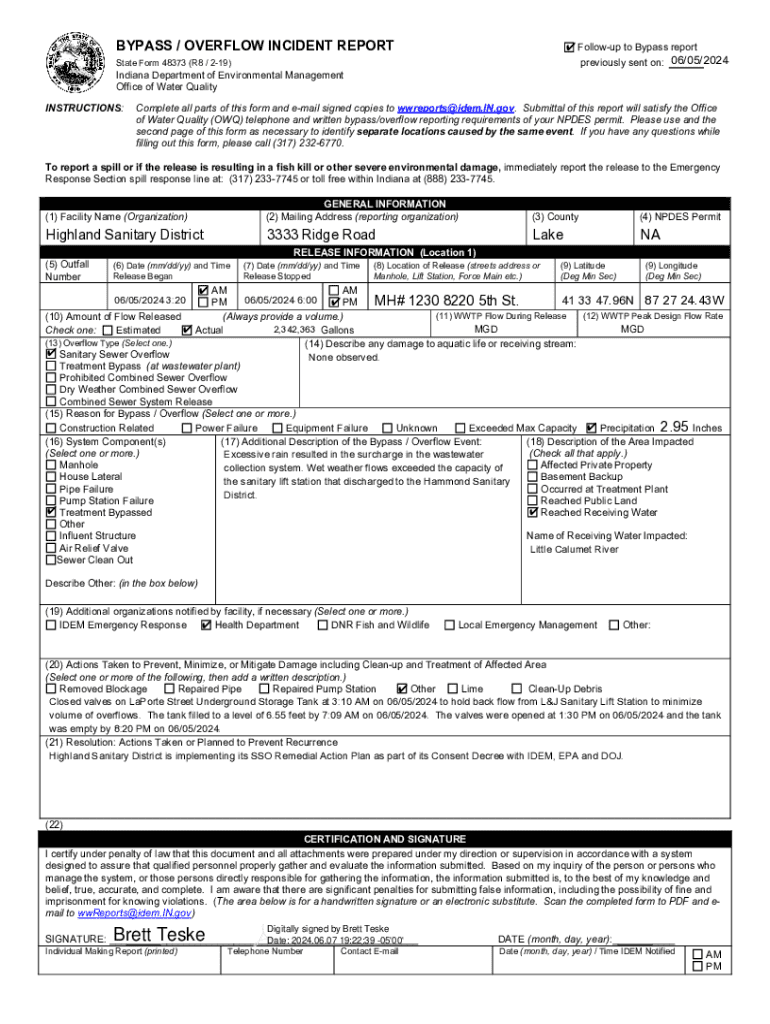 Get the free Bypass / Overflow Incident Report - highland in