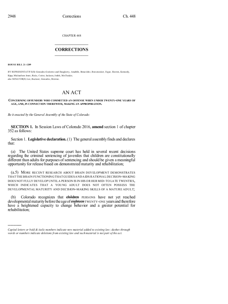 This chapter outlines House Bill 21-1209 concerning offenders who committed offenses when under twenty-one years of age and details legislative declarations, appropriations, and provisions for parole