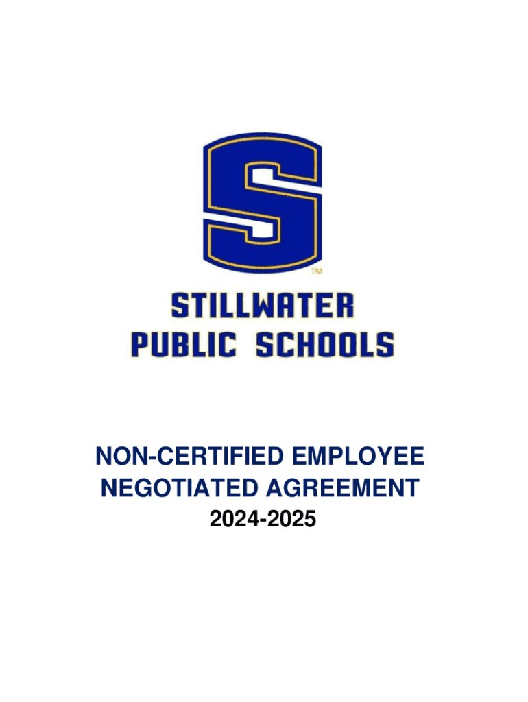 This document details the terms and conditions of employment for non-certified employees, including provisions related to duration, compensation, employee leaves, and negotiations between the Stillwater