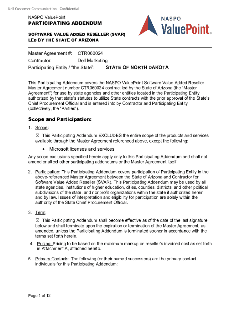 This document is a Participating Addendum for the NASPO ValuePoint Software Value Added Reseller Master Agreement, detailing the participation of the State of North Dakota with conditions, terms,