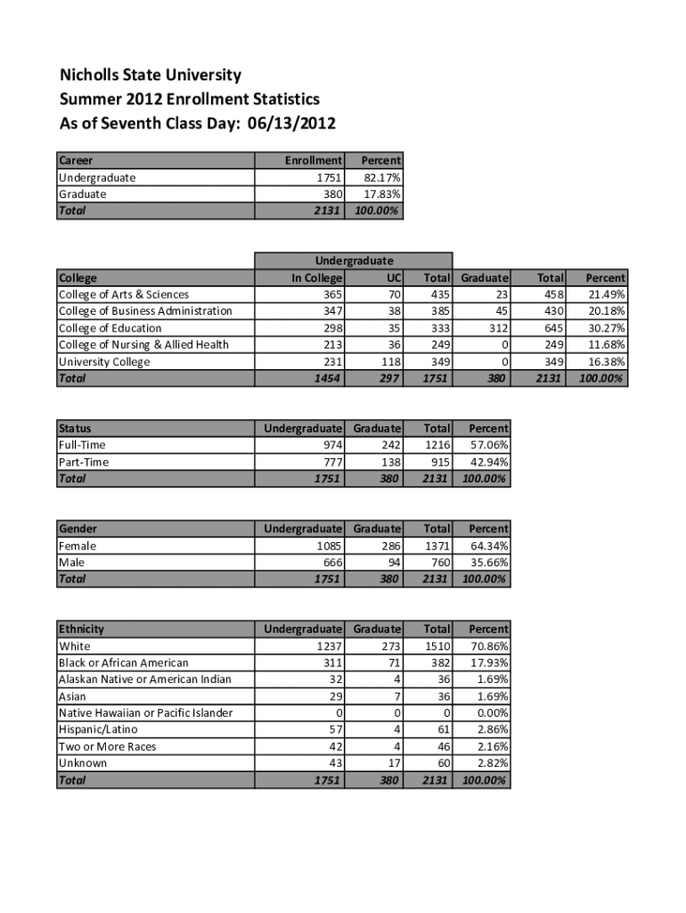 Get the free Nicholls State University Summer 2012 Enrollment Statistics