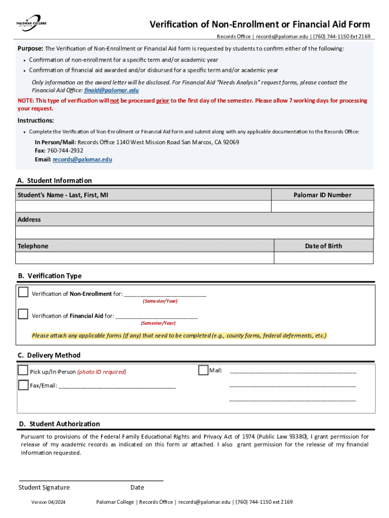 Get the free Verification of Non-enrollment or Financial Aid Form