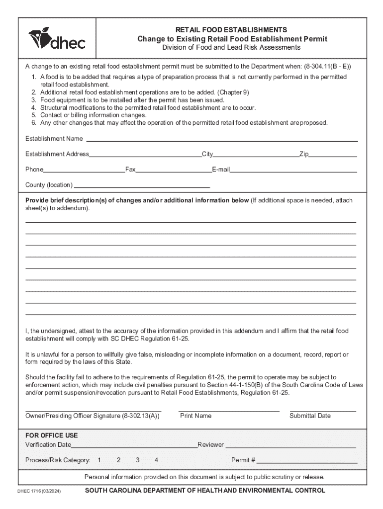 Several questions arise frequently regarding the DHEC Form 1716. Common queries usually pertain to timeline expectations, the ability to make changes to existing permits, and the nuances of the renewal process. Understanding these points can help navigate the complexities of food establishment regulations.
