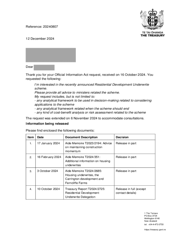 Reference: 2024080712 December 2024Dear Thank you for your Official Information Act request, received on 16 October 2024. You requested the following: Im interested in the recently announced Residential