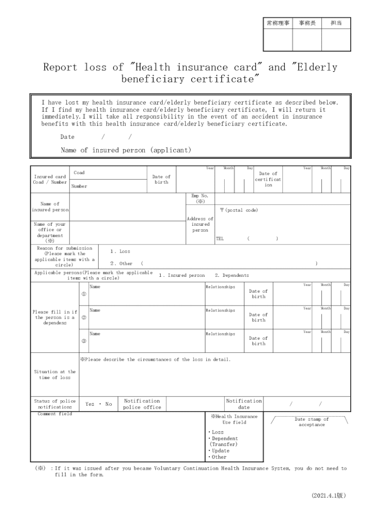 健康保険証および高齢者受給者証の紛失について報告するためのフォームで、個人情報や紛失の詳細を記入します。