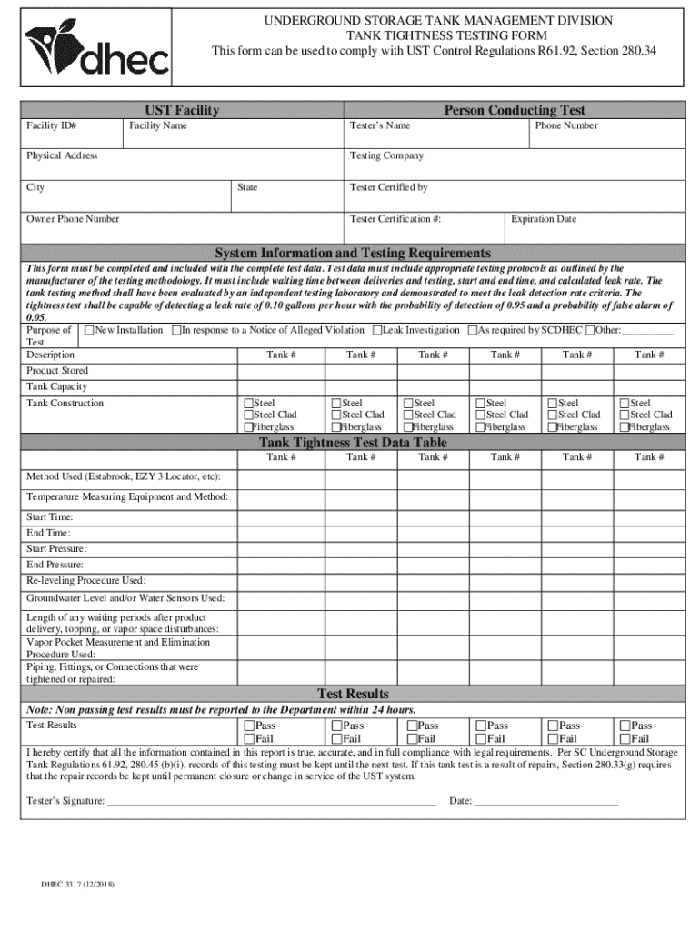 Owners and operators of underground storage tanks (USTs) and aboveground storage tanks (ASTs) are required to file a tank tightness testing form as part of their regulatory compliance.