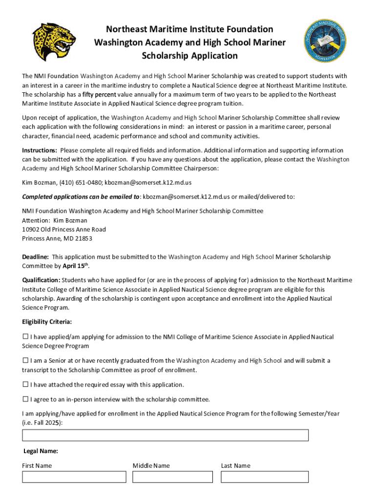This document is a scholarship application designed to support students interested in a maritime career pursuing a Nautical Science degree at Northeast Maritime Institute.