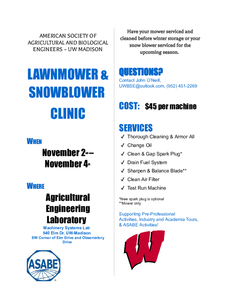 This document provides details about a clinic for servicing and winterizing lawnmowers and snowblowers, including costs, services, contact information, and registration instructions.