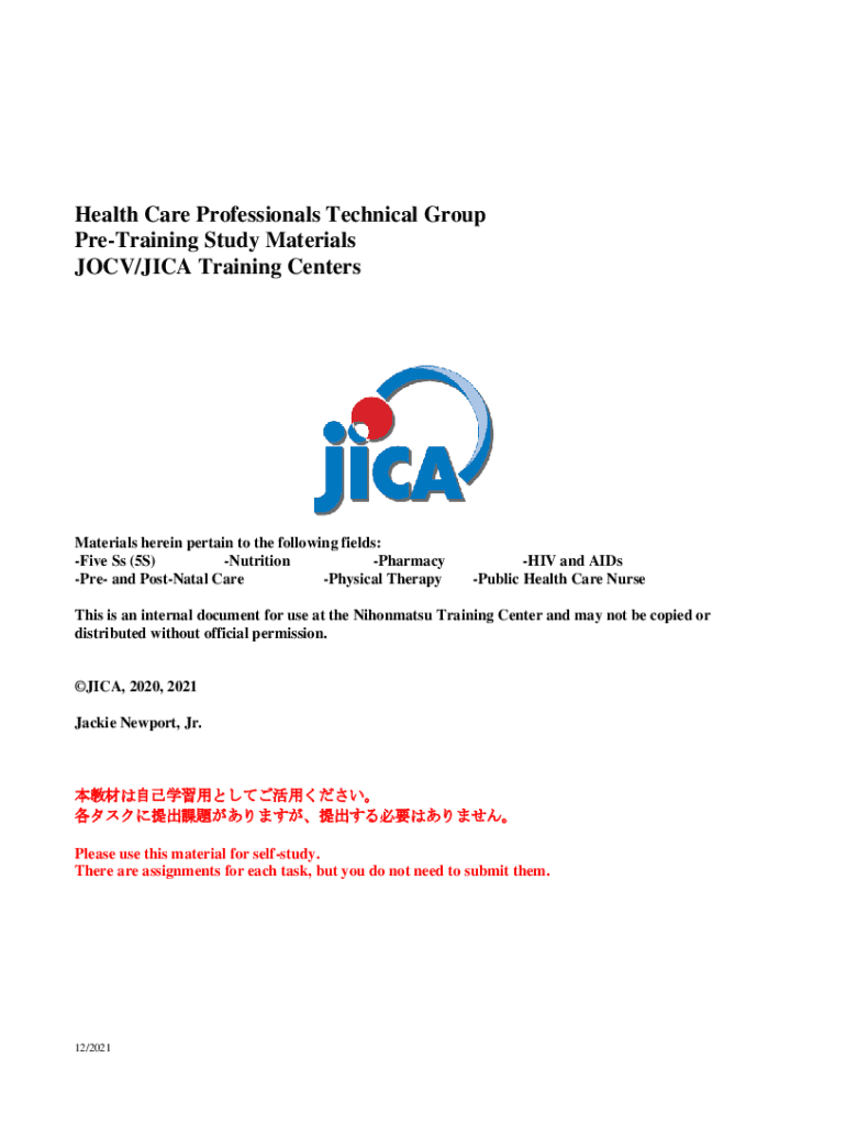 This document serves as a preparatory guide for health care professionals participating in the JOCV/JICA training program, outlining various health-related topics and tasks to enhance their skills