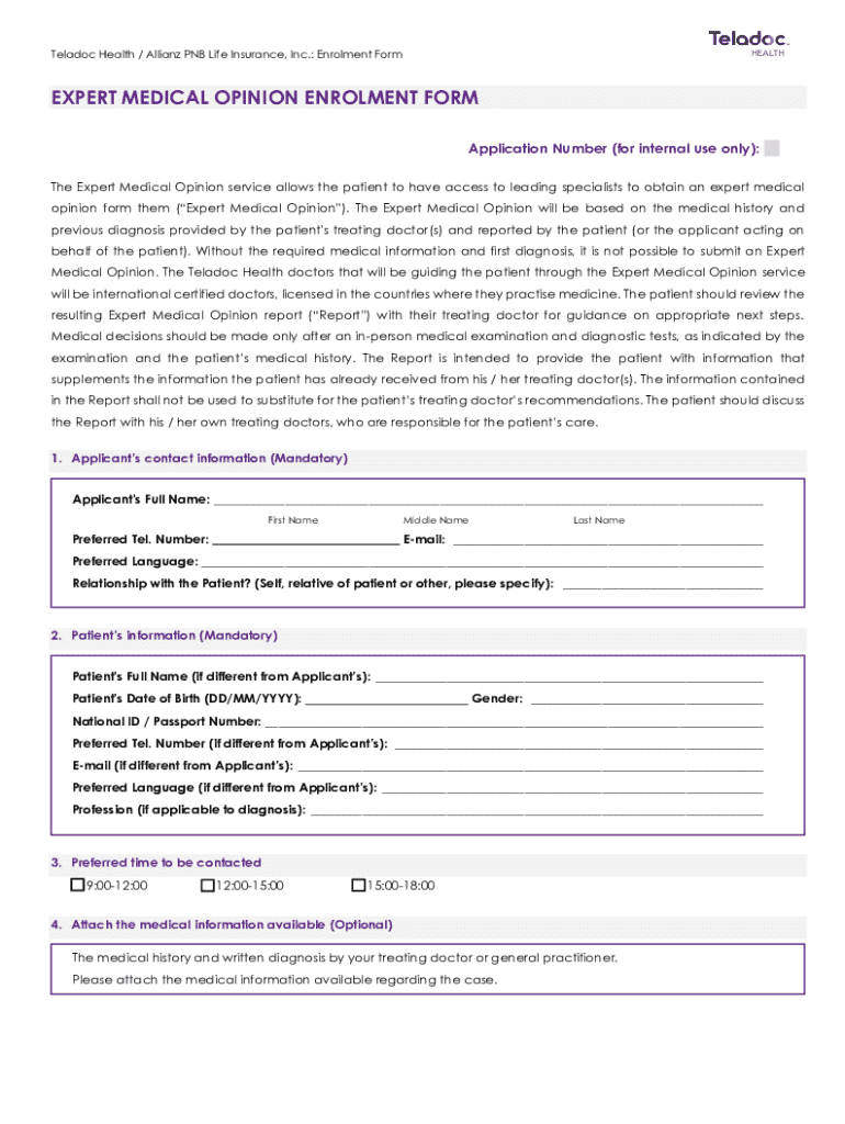 The Expert Medical Opinion Enrolment Form is designed to allow patients to access expert medical opinions from certified doctors based on their medical history and diagnoses.