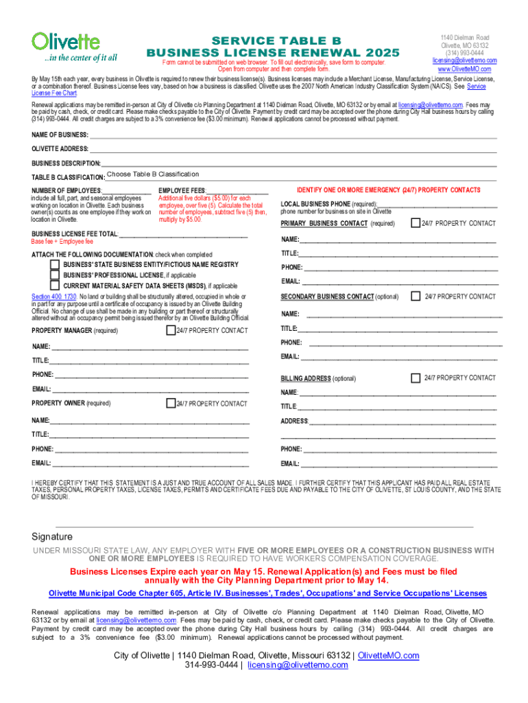Get the free Service Table B Business License Application - Olivette, MO