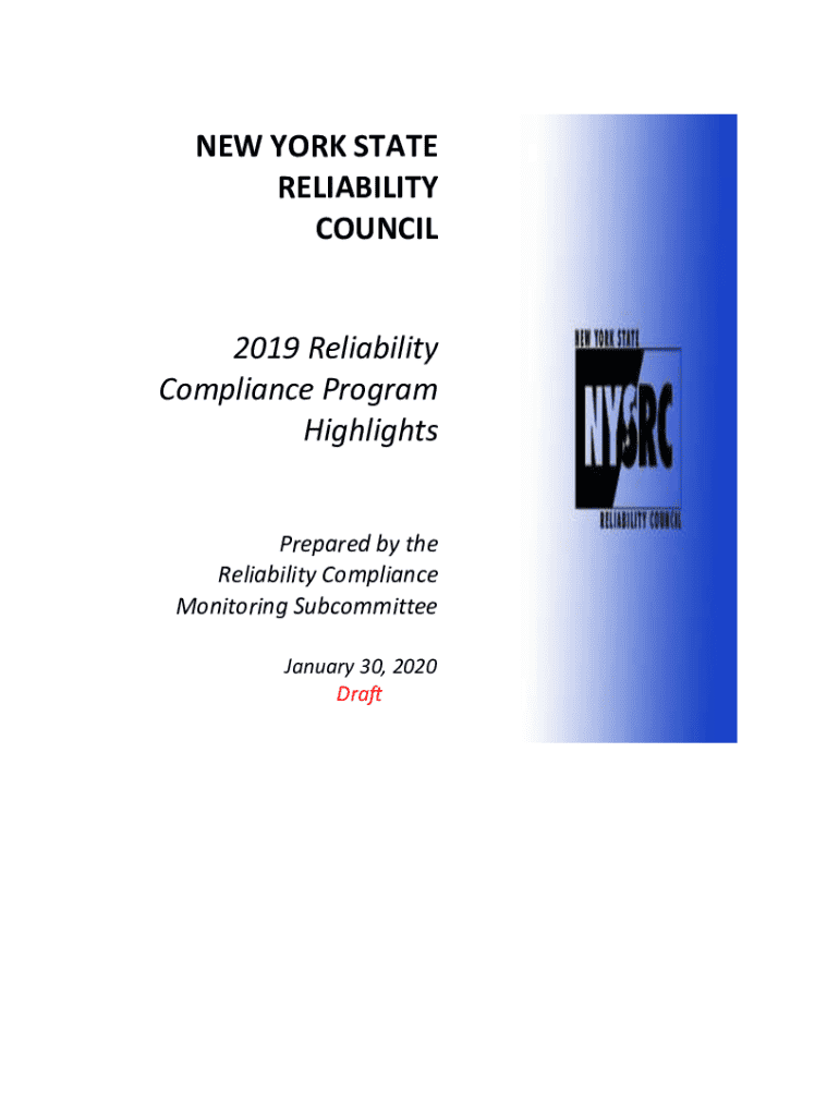 This document presents the highlights of the 2019 NYSRC Reliability Compliance Program, focusing on compliance assessments related to the reliability rules in New York State.