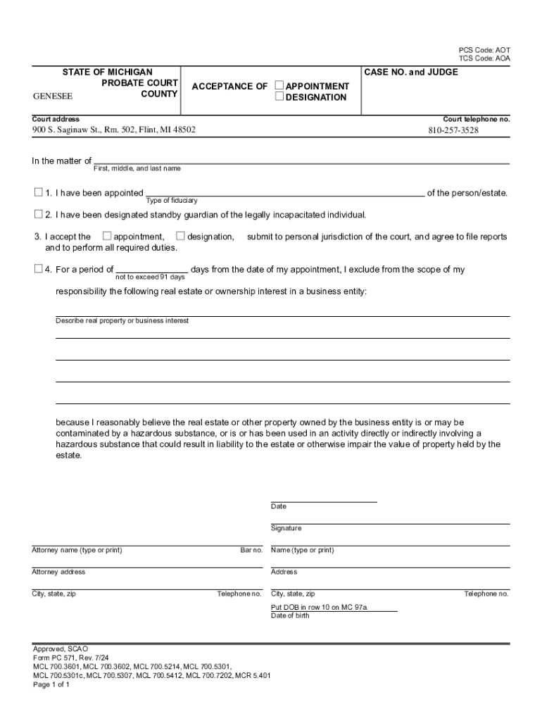 This document is used for the acceptance of appointment as a fiduciary or standby guardian in probate cases in Genesee County, Michigan, including the handling of personal identifying information