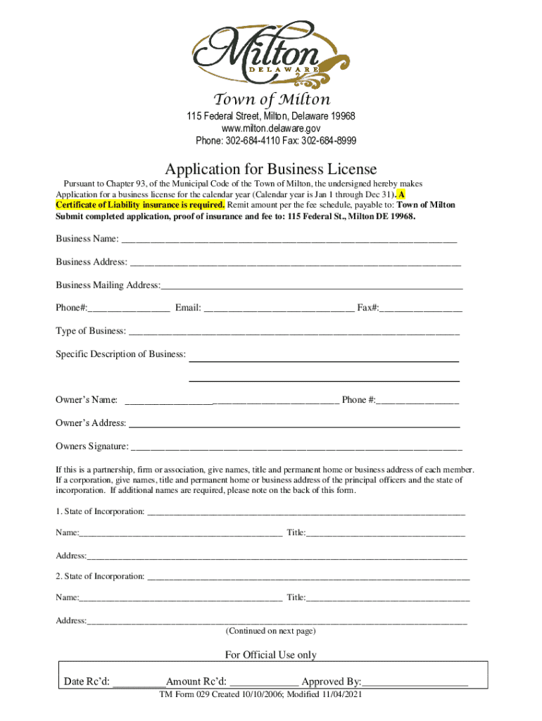 This document is an application form for obtaining a business license in the Town of Milton, detailing the necessary requirements including business information, owner details, and fee schedule.
