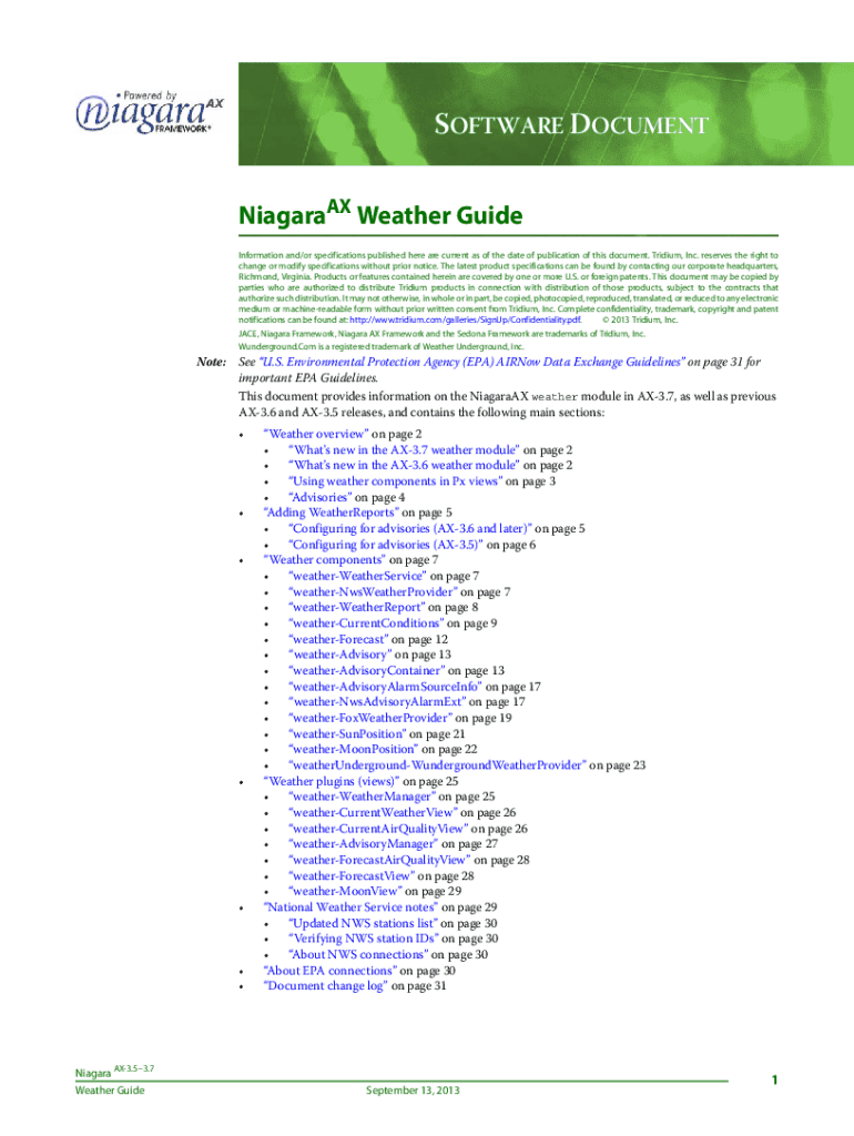 This document provides detailed information and specifications for the NiagaraAX weather module, including updates in versions AX-3.5 to AX-3.7, and features for managing weather data, including alerts,