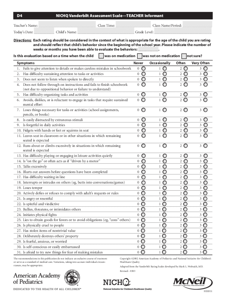 Get the free Nichq Vanderbilt Assessment Scale—teacher Informant
