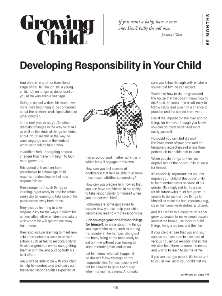 Jessamyn West69 MONTHSIf you want a baby, have a new one. Dont baby the old one.Developing Responsibility in Your Child Your child is in another transitional stage of his life. Though still a young