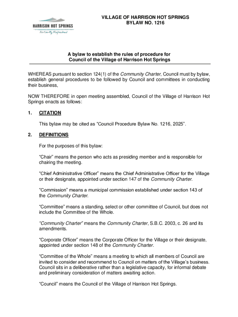 A bylaw to establish the rules of procedure for Council of the Village of Harrison Hot Springs, outlining the governance of meetings, decision-making processes, and roles within the Council.