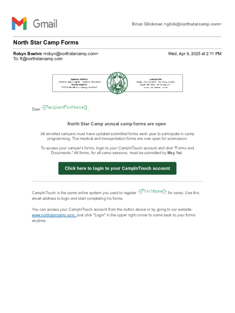The document outlines the required annual forms for enrolled campers at North Star Camp, detailing the types of forms needed, submission deadlines, and instructions for accessing and completing these