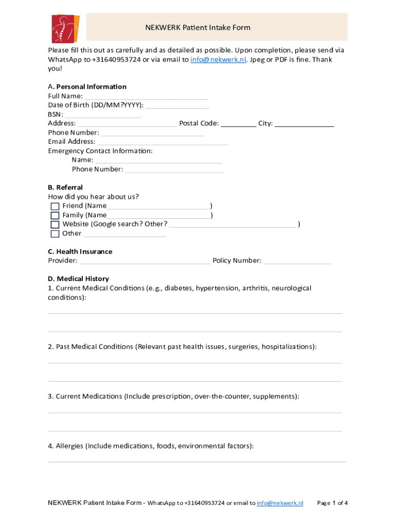 The Nekwerk patient intake form is divided into several sections, each designed to capture specific information essential for patient care. Understanding these components is critical for both patients and healthcare providers.