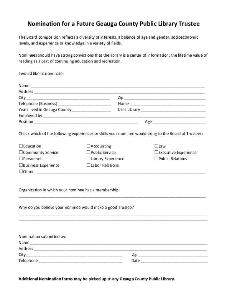 Get the free Nomination for a Future Geauga County Public Library Trustee