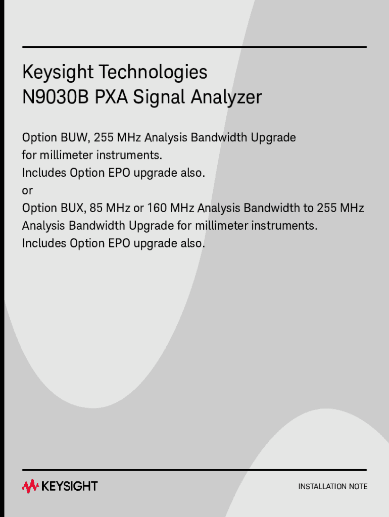 This document provides installation notes for the 255 MHz Analysis Bandwidth upgrade for the N9030B PXA Signal Analyzer, including parts, procedures, and installation requirements.