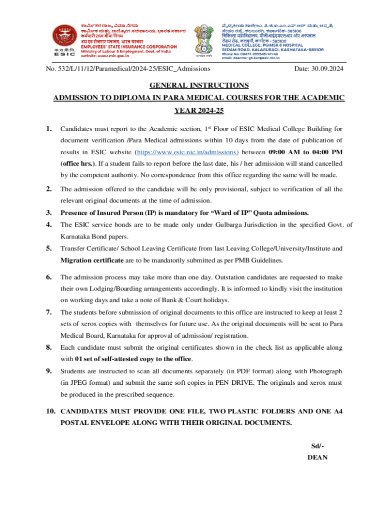 Candidates aspiring to enroll in paramedical courses under the ESIC for the year 2024-25 are required to file no 532l1112paramedical2024-25esic_admissions.