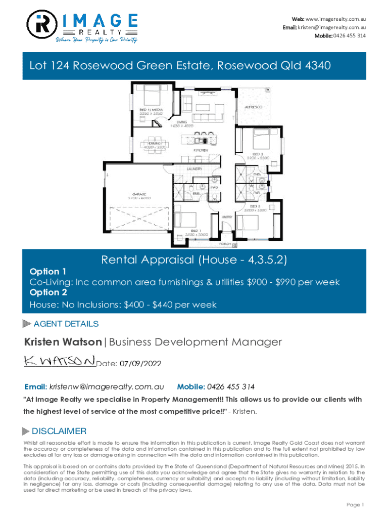 This document provides a rental appraisal for a property at Lot 124 Rosewood Green Estate, along with a rental return guarantee agreement from Image Realty.