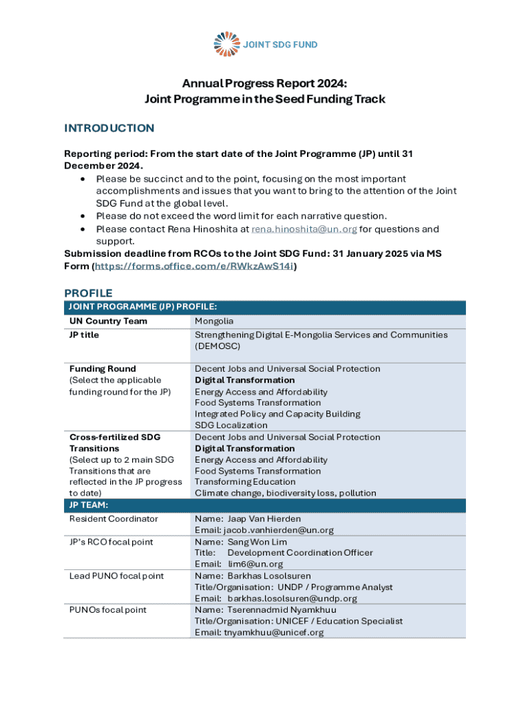 This document provides an overview of the Joint Programme\'s progress in Mongolia, focusing on achievements in digital services, capacity building, and partnerships to promote sustainable development