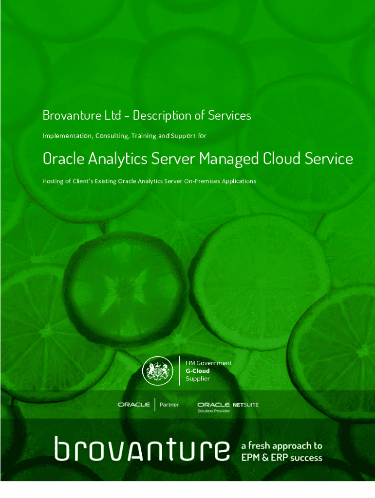 This document provides a comprehensive overview of the services offered by Brovanture Ltd for Oracle Analytics Server, including migration, hosting, implementation, consulting, and support services