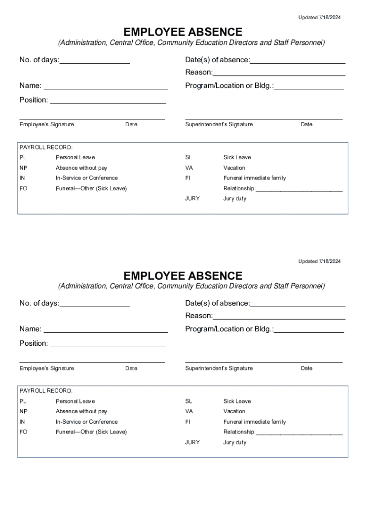 An effective employee absence form should include several essential elements that capture the necessary information for tracking absences. First and foremost, it should contain basic employee information such as name, department, and employee ID to clearly identify who is taking time off. Following employee details, the form must outline the dates of absence, which specifies when the individual will be unavailable, allowing for better scheduling and resource allocation.
