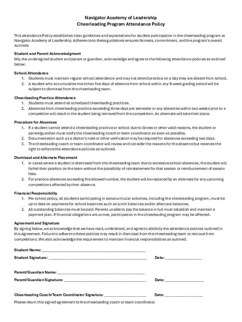 Get the free Navigator Academy of Leadership Cheerleading Program Attendance Policy