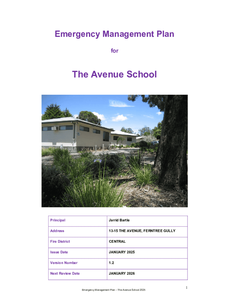 This document outlines the emergency management plan for The Avenue School detailing procedures for various emergency situations including evacuation, lockdown, and specific emergencies that could