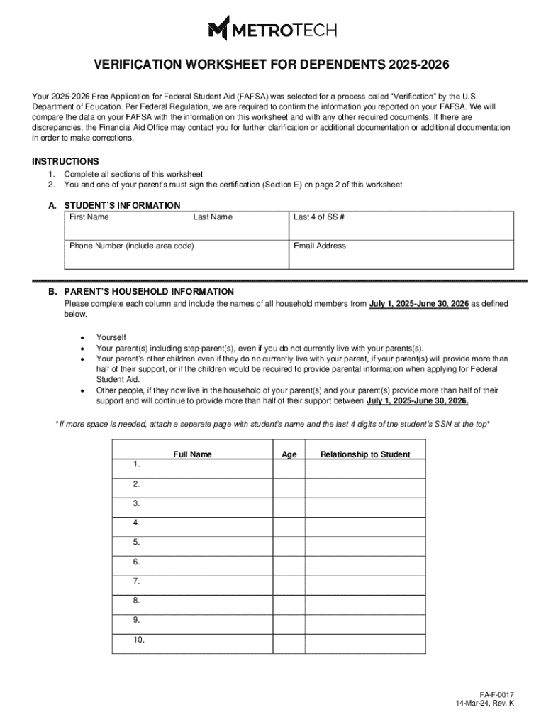Get the free Verification Worksheet for Dependents 2025-2026