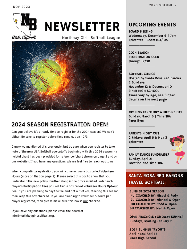 Staying organized is crucial for participants in the Northbay Girls Softball League. Below are key dates to mark on your calendars.