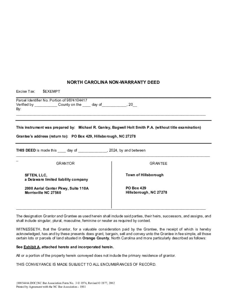 This document serves as a legal instrument for the transfer of property ownership in the state of North Carolina, specifically outlining the terms and disclaimers associated with the conveyance.
