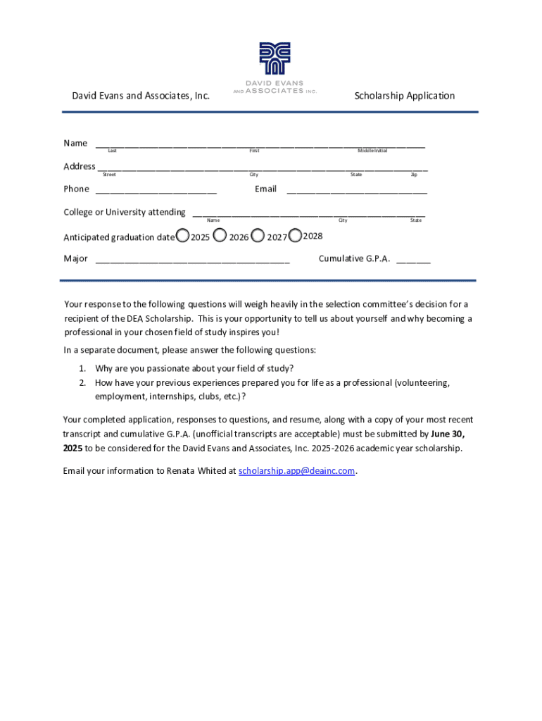 Get the free David Evans and Associates, Inc. Scholarship Application