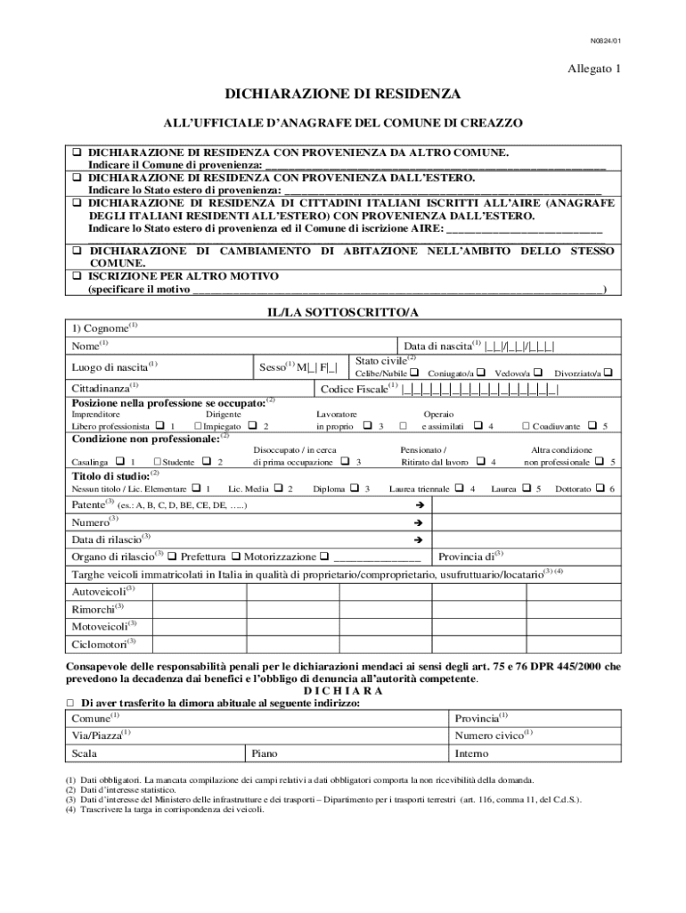 Modulo per la dichiarazione di residenza da presentare all\'ufficiale d\'anagrafe del comune di Creazzo, comprendente diverse sezioni per la dichiarazione da altro comune, dall\'estero, e per il cambiamento