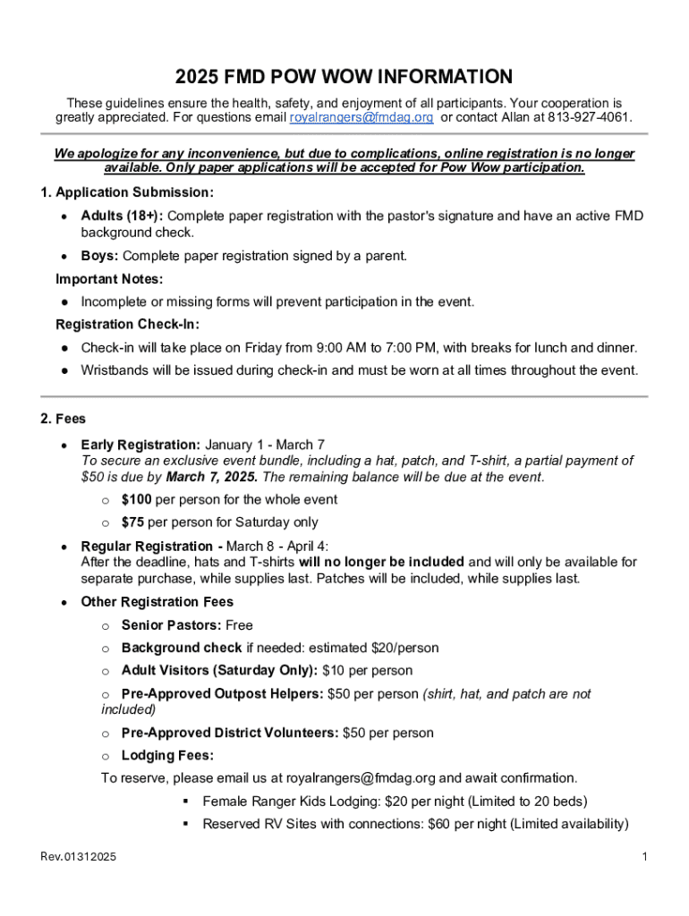 The 2025 FMD Pow Wow Form is a crucial document that facilitates participant registration for the event. Its importance cannot be overstated, as it serves not only as a means of securing a place for attendees but also as a tool for event organizers to gauge attendance and plan effectively. It is imperative for potential participants, leaders, and volunteers to fill out this form accurately and promptly.