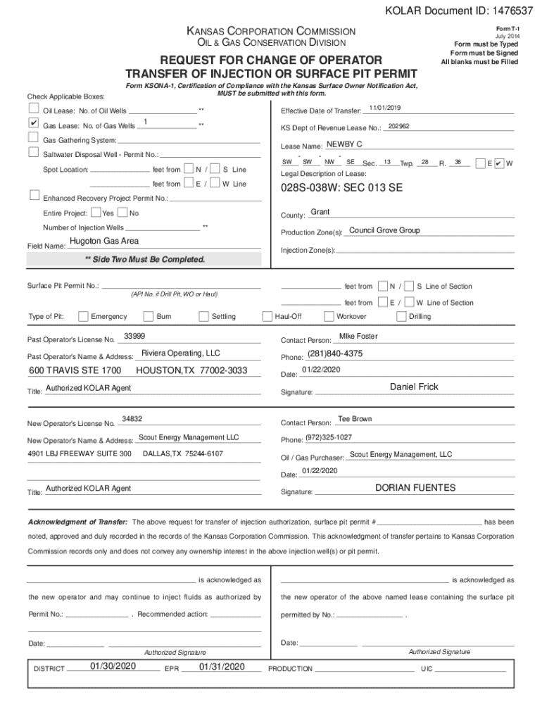 Request for Change of Operator Transfer of Injection or Surface Pit Permit for Kansas Corporation Commission.