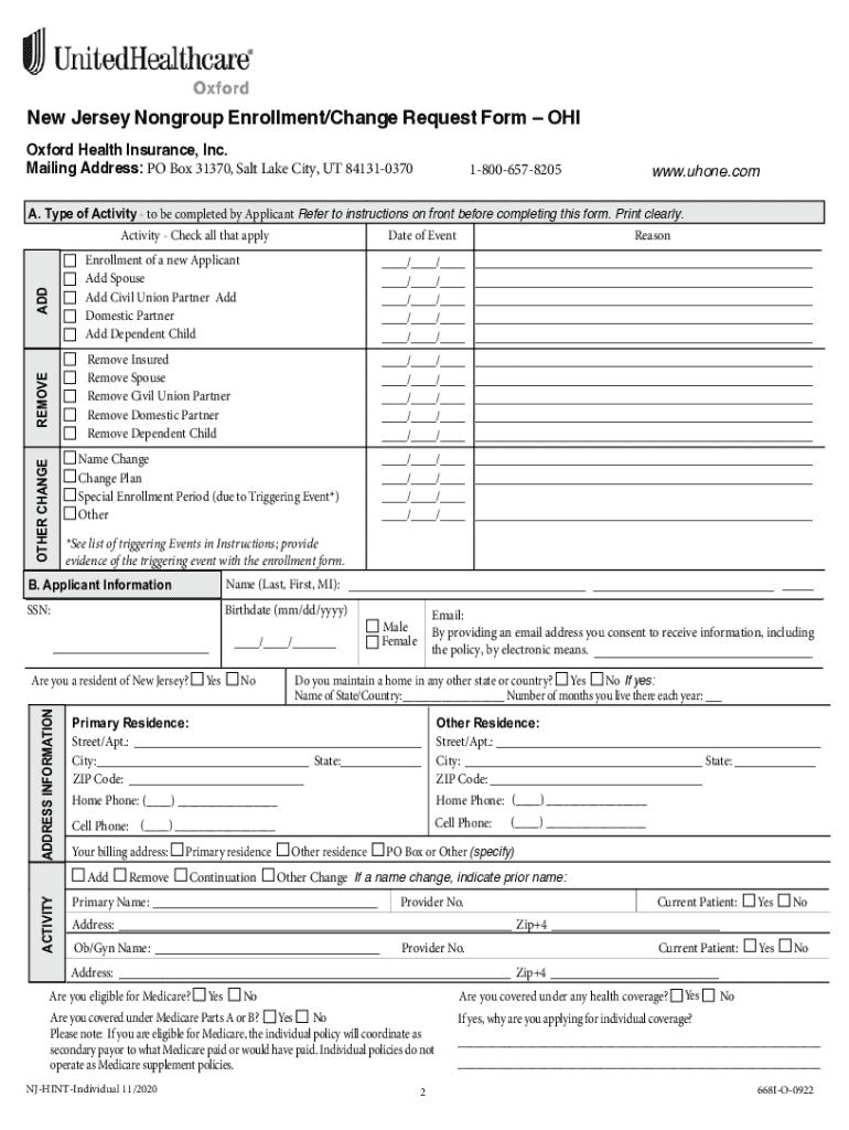 Get the free New Jersey Nongroup Enrollment/change Request Form – Ohi