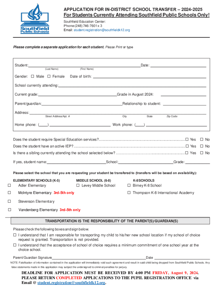 Get the free Application for in-district School Transfer – 2024-2025
