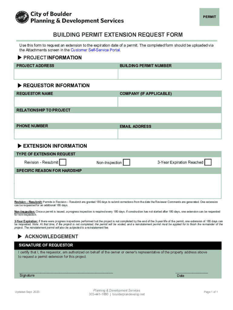 Filling out a building permit extension request form can seem daunting, but breaking it down into sections makes the process manageable. The first component typically requires personal and project information, including applicant name, project address, and permit number.