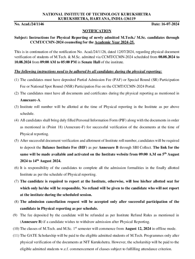 This document serves as a notification detailing the instructions for physical reporting of newly admitted M.Tech. and M.Sc. candidates at NIT Kurukshetra for the Academic Year 2024-25, including